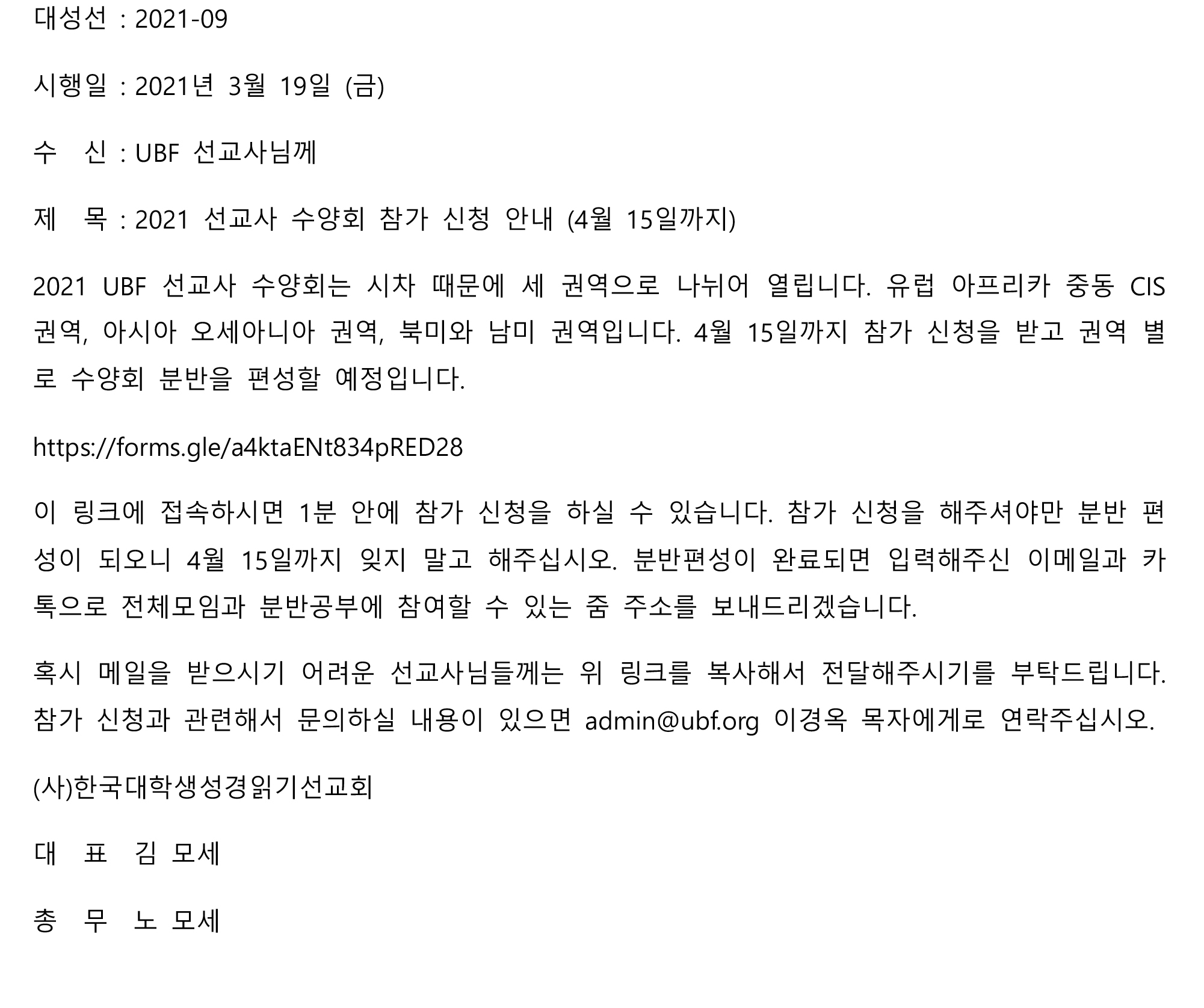 Please copy and forward the above link to the missionaries who cannot receive the mail. If you have any questions regarding your application, please contact Shs. Lee, Kyoung-ok at admin@ubf.org.