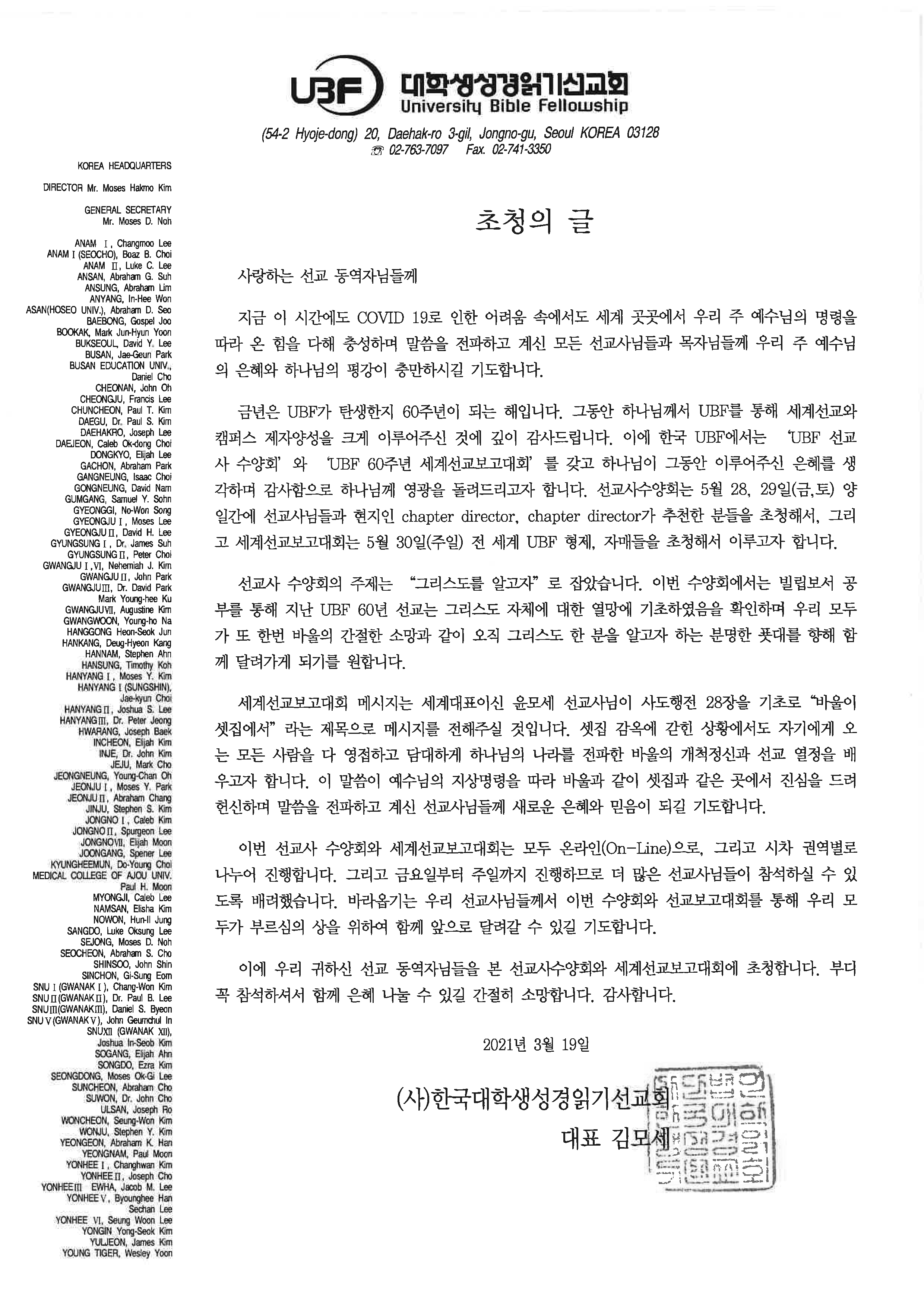 - (Update 4/20): Spanish Video is added to 2021 UBF World Mission Report Promotional Video (English) (Spanish) (Korean)
