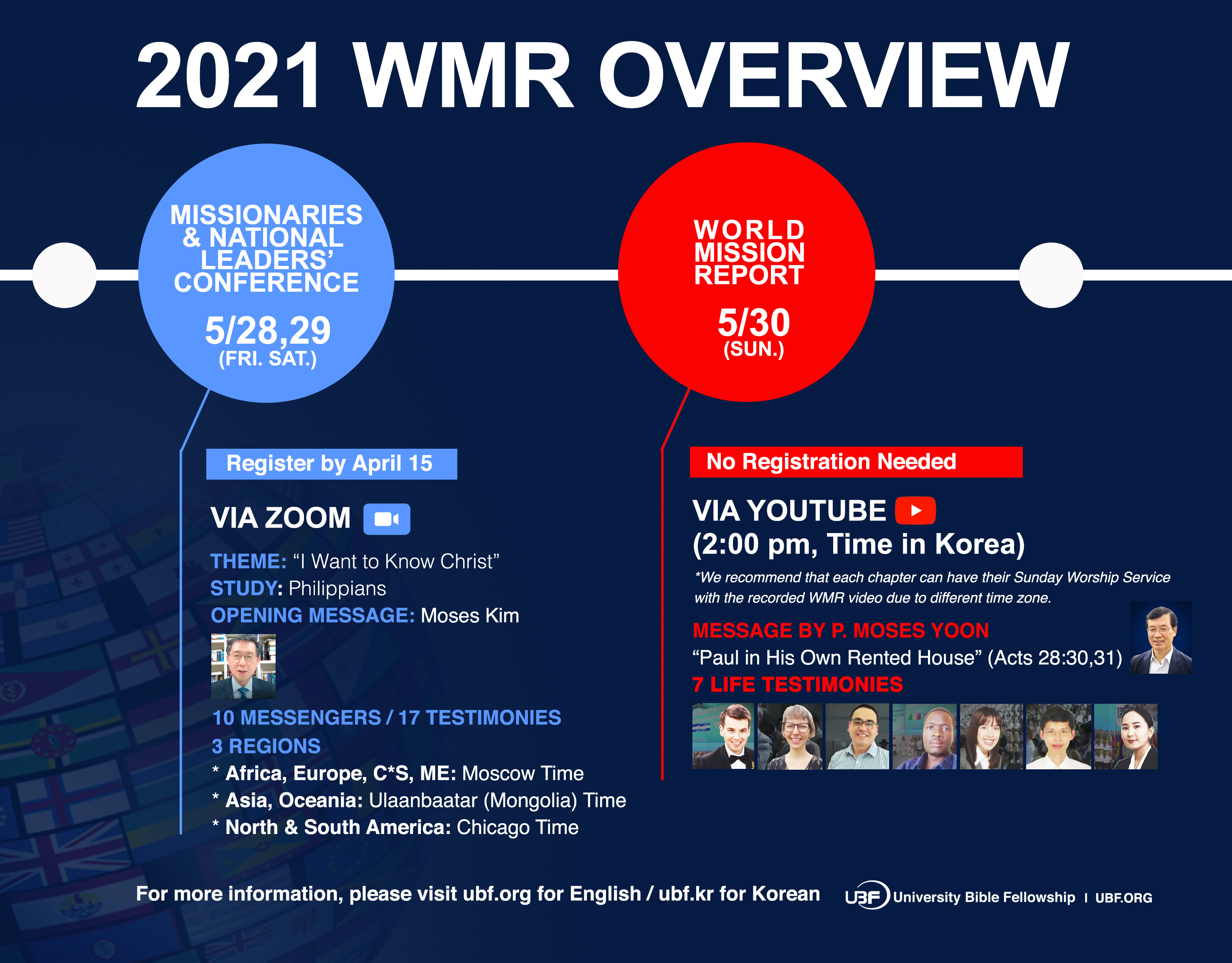 The 2021 UBF Missionaries and National Leaders Conference will be held in three regions(on-line) due to the time difference (Europe, Africa, Middle East, CIS/ Asia, Oceania/ North & South America). We will receive applications by April 15th and organize Bible Study groups for each region.