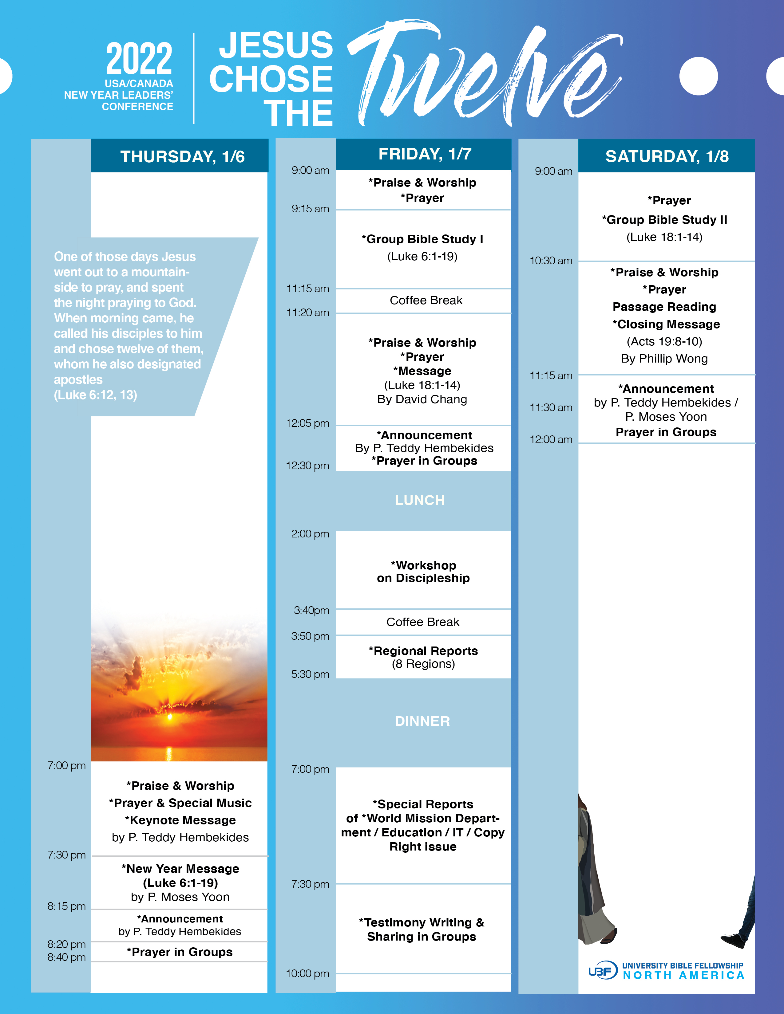 God blessed the 2022 North America Leaders online conference (Jan.6-8) with the theme, "Jesus Chose the Twelve," emphasizing prayer and discipleship. We heard messages by P. Teddy Hembekides (NA coordinator), P. Moses Yoon (UBF General Director) based on Lk 6:6-19, D*avid Chang of Edmonton based on Lk 18:1-14, and P*hilip Wong of Montreal based on Ac 19:8-10. 254 leaders in NA registered. There were representative praise teams and prayer servants, a meaningful workshop on Discipleship in Community, 8 moving regional reports, special departmental reports, and 2 group Bible studies. P. Moses Yoon urged us to pray to love even one person with a shepherd's heart. Then God will do his own work. P. Teddy urged us to grow as a loving community and to raise a new generation of shepherds and missionaries.